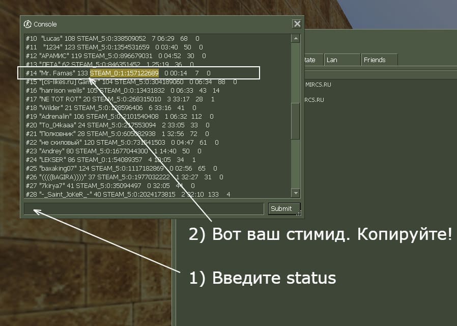 Пополнить баланс в Профиле Зайти в магазин привилегий и выбрать услугу , тариф Тип привязки - STEAM ID (Для того чтобы посмотреть свой STEAM ID - НЕ ВАЖНО У ВАС STEAM ИГРА ИЛИ NON STEAM(ПИРАТКА) STEAM_ID есть на любой CS Запустить вашу CS 1.6 - зайти на любой сервер ( желательно пустой ) и прописать в косноль status Там выдаст ваш STEAM ID выглядит так STEAM_2:1:157178923 Скопировать и прописать в привязке Поставить галочку Я ознакомлен с правилами сервера и согласен с ними Нажать Купить - готово